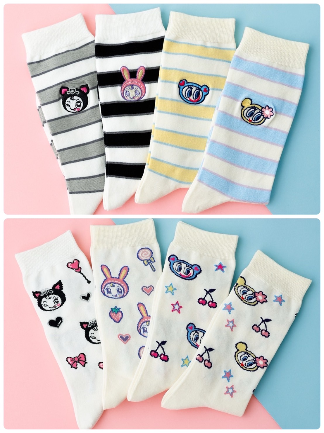 These socks feature characters from "ANGEL BLUE" and "Mezzo Piano," resulting in the most pop and cute designs!