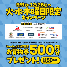- Receive a 500 yen cashless payment voucher that can be used in-store on Tuesdays, Wednesdays, and Thursdays only from September 9th (Tuesday) to December 25th (Thursday)!