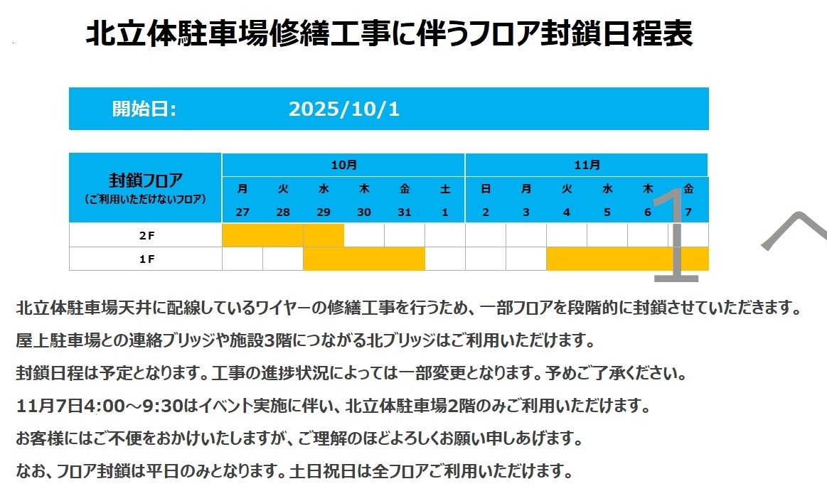 Due to repair work on the ceiling wires in the North Parking Garage, there will be periods when the North Parking Garage will be unavailable on each floor.