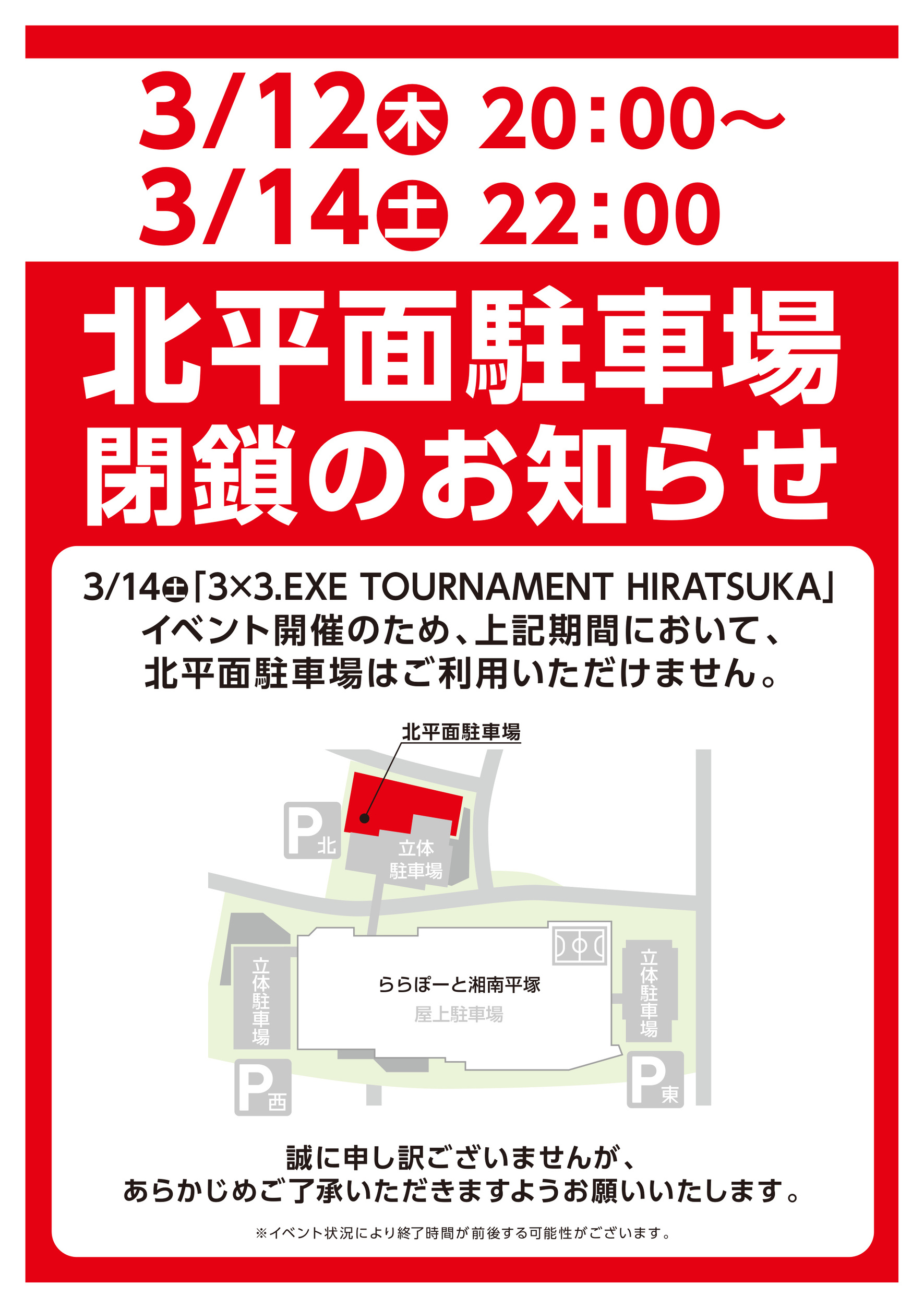 Notice of usage restrictions for the North Parking Lot from Thursday, March 12th to Saturday, March 14th