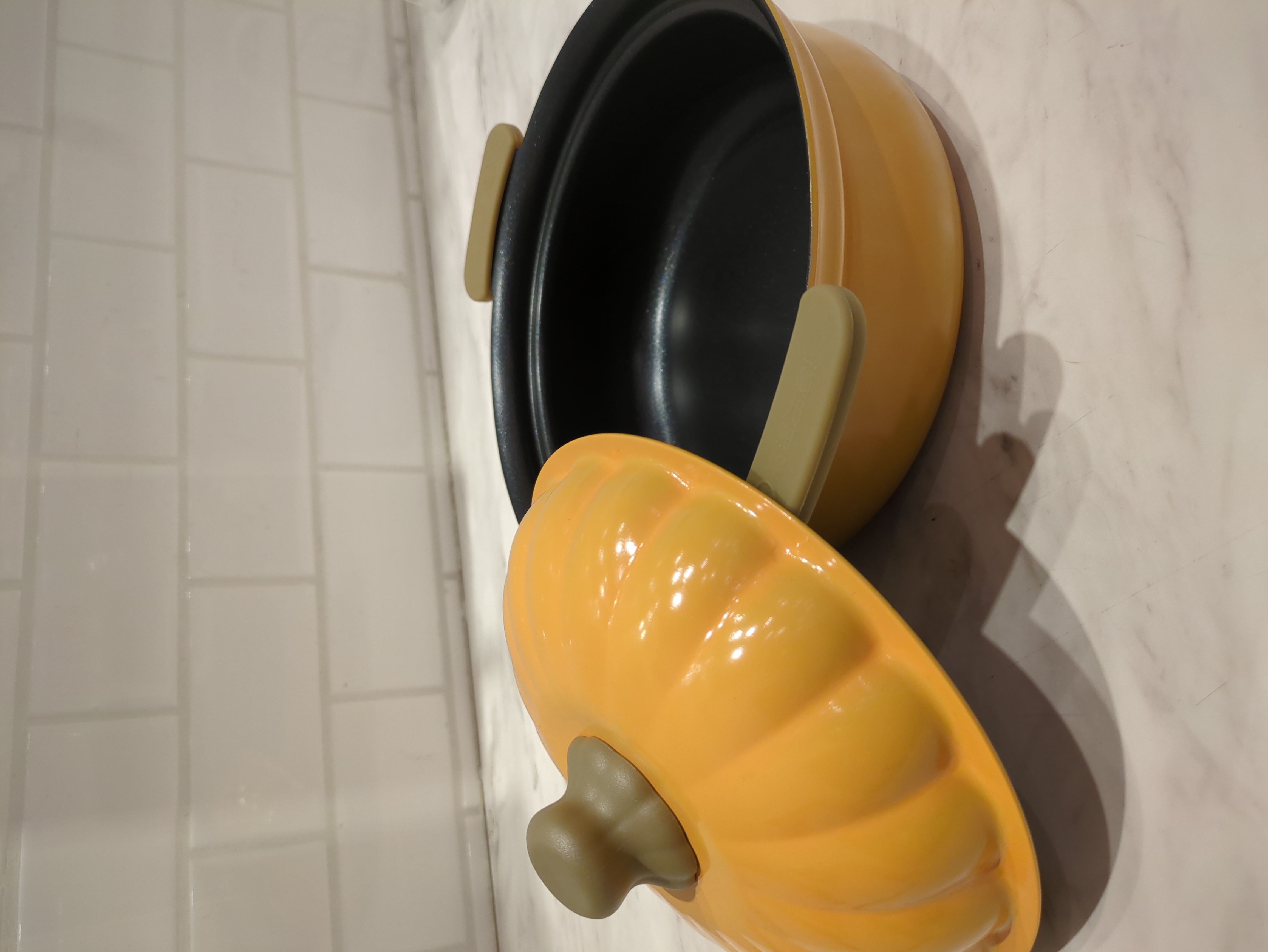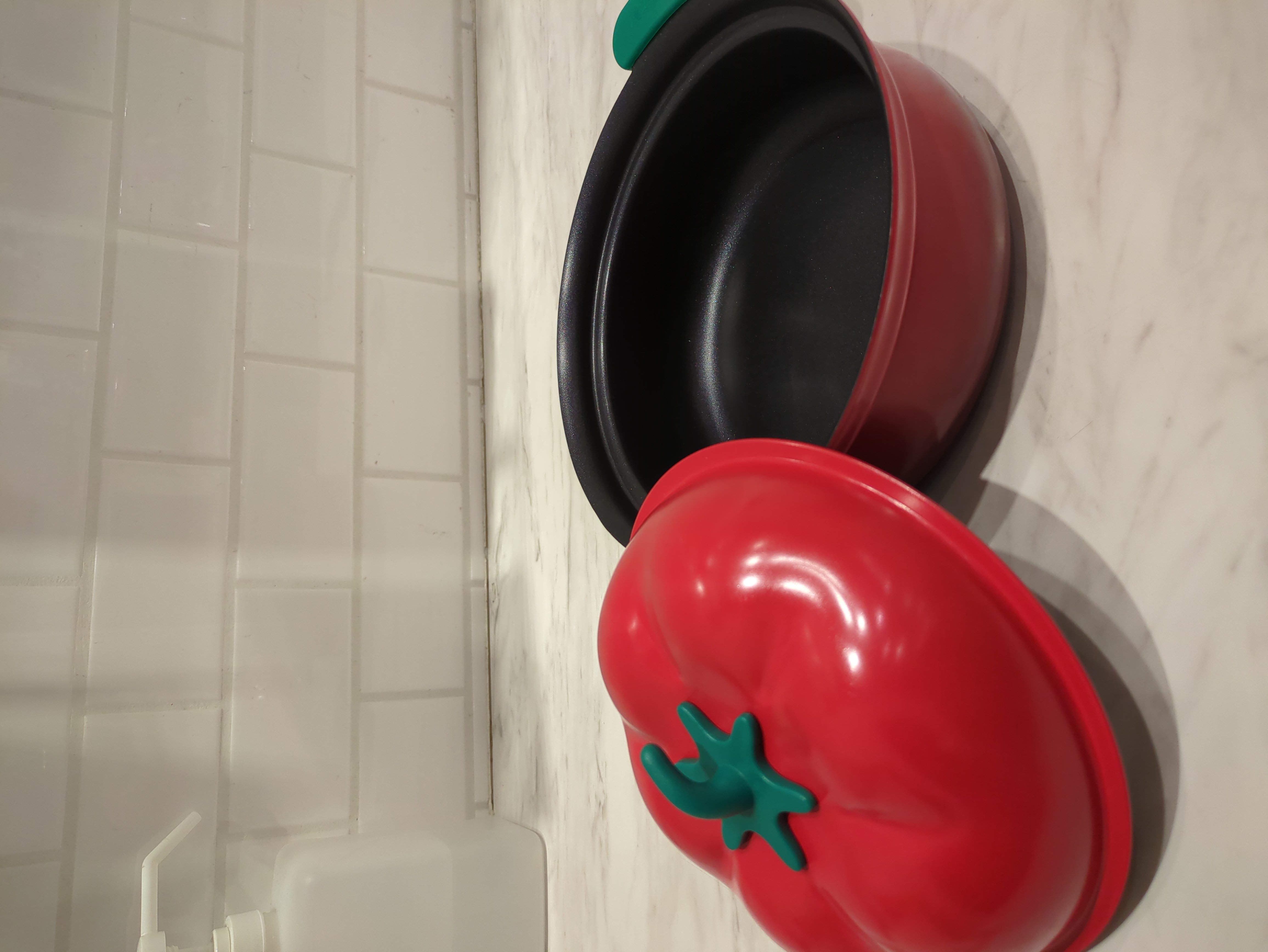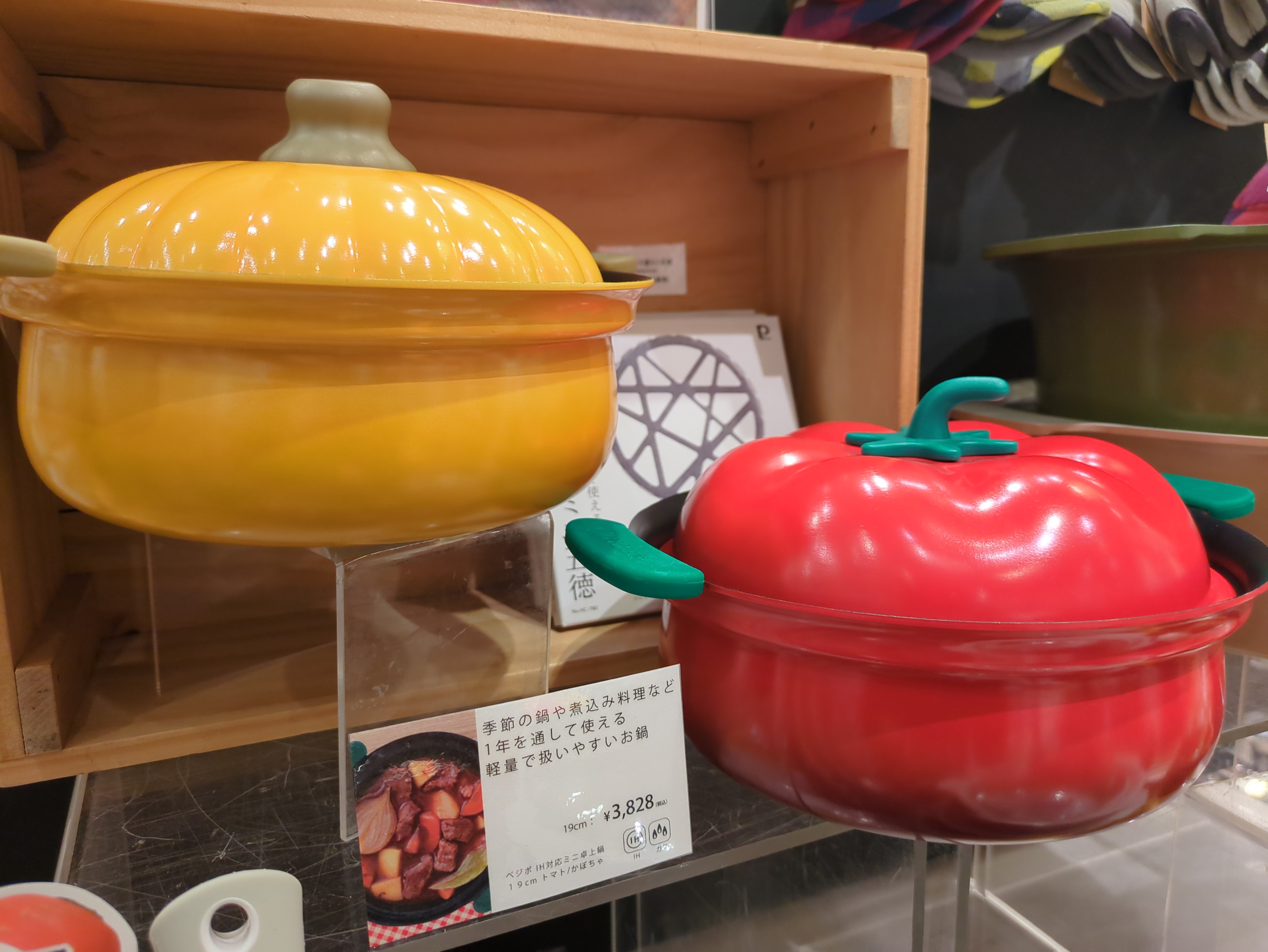 可愛らしいトマトとカボチャの軽量お鍋、フッ素樹脂加工でIHクッキングヒーターにも対応しております、このお鍋でご友人とお食事はいかがでしょうか?