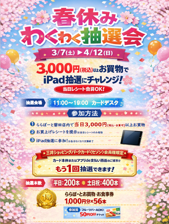 In addition, Mitsui Shopping Park Card<<Saison≫or appdeIf you show the payment screen,1You can participate in the lottery.