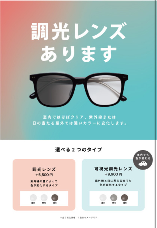 Complete sets of glasses are available from 5,500 yen (including lenses).