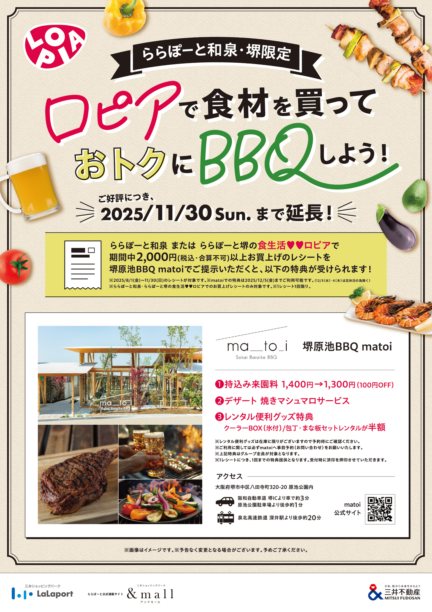 - [LOPIA x Sakaiharaike BBQ "matoi" collaboration project] Enjoy BBQ at a great price with purchases of 2,000 yen or more!