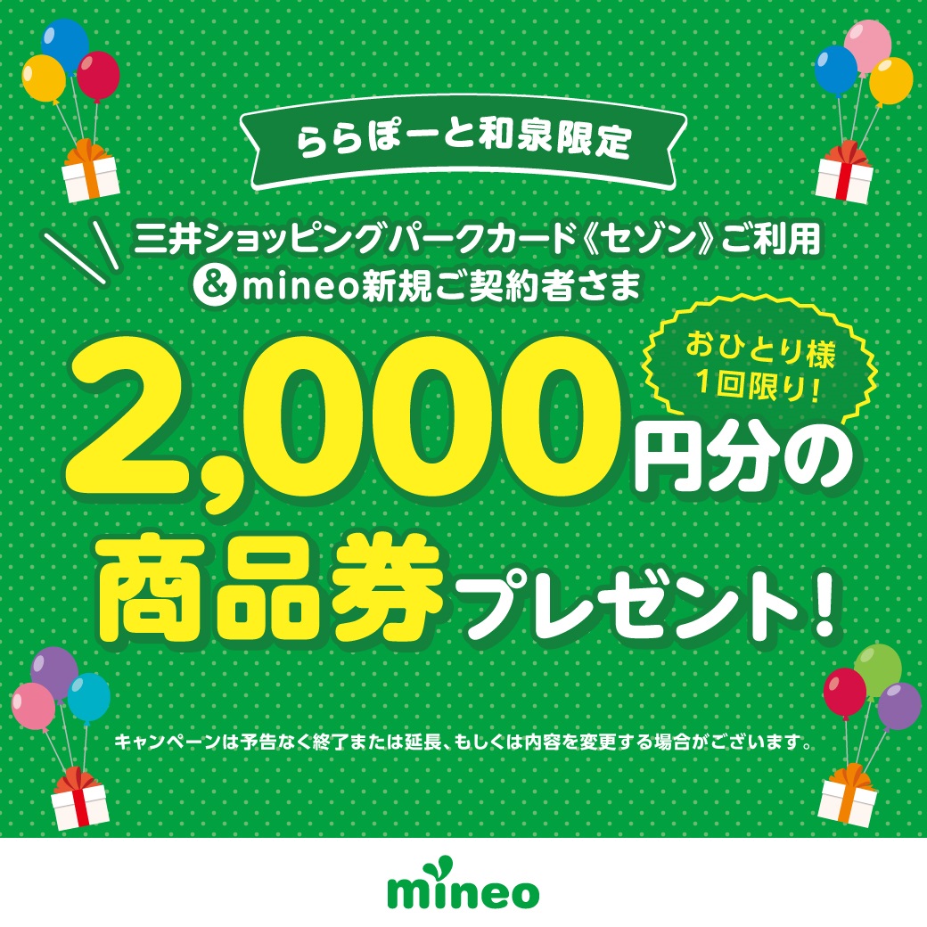 If you sign up for a new mineo contract at LaLaport IZUMI between Thursday, September 11, 2025 and Friday, October 31, 2025, and then spend a total of 10,000 yen or more (tax included, can be combined, including app payments) with your Mitsui Shopping Park Card (Saison) between Thursday, September 11, 2025 and Sunday, November 30, 2025, you will receive a 2,000 yen VISA gift card!