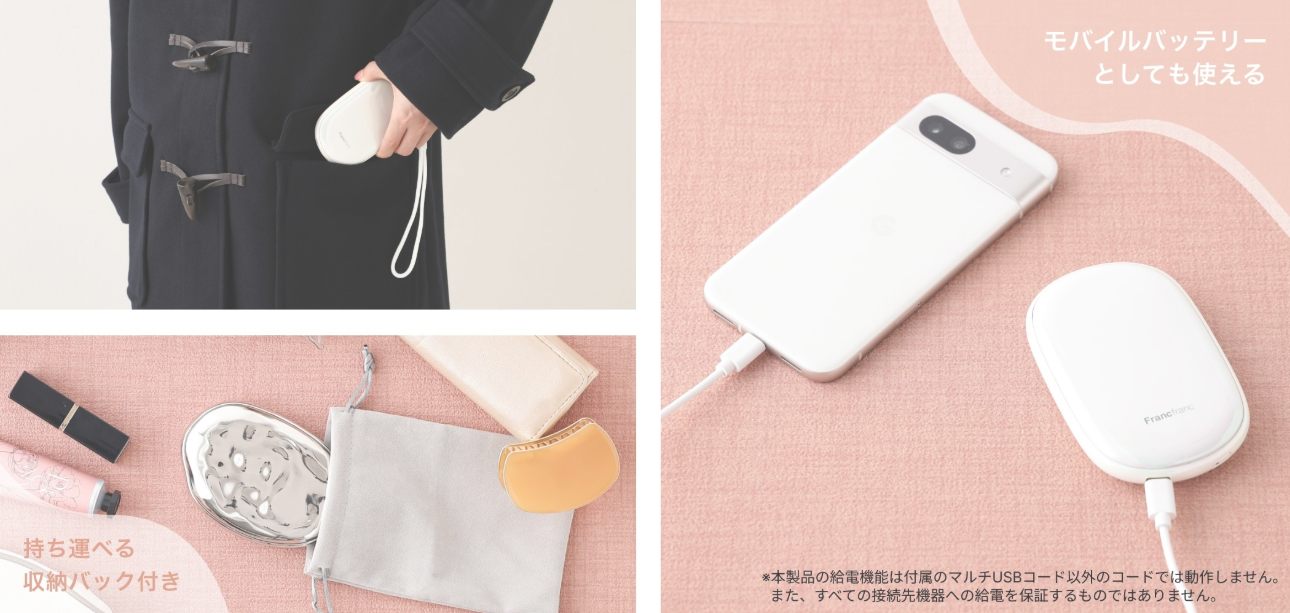 付属のUSBコードをACアダプターやパソコンに繋いで充電でき、モバイルバッテリーとしても利用可能です。
