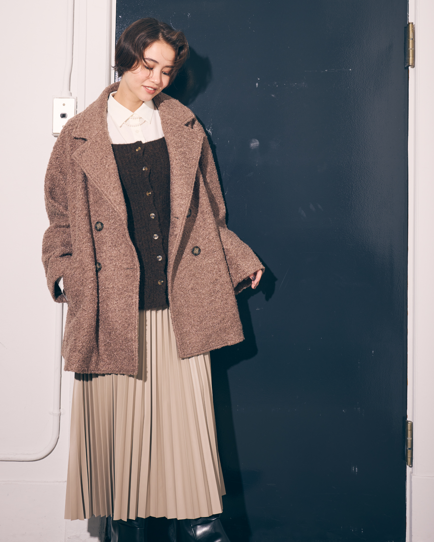 This coat can be worn in two different styles: with the collar open or in a pea coat style.