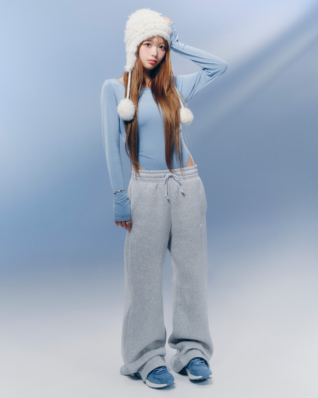 寒色ブルー、ホワイト、グレーでまとめた冬ムードのリラックスコーデ。主役は Air Max Excee。