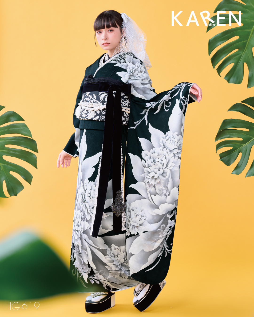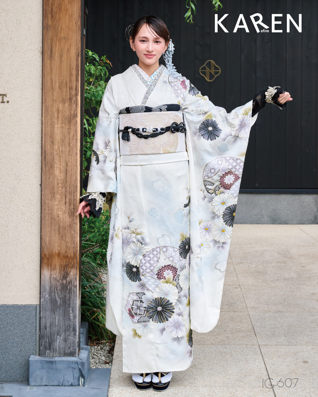The white furisode kimono features a peacock feather motif and heart patterns as its focal point♪