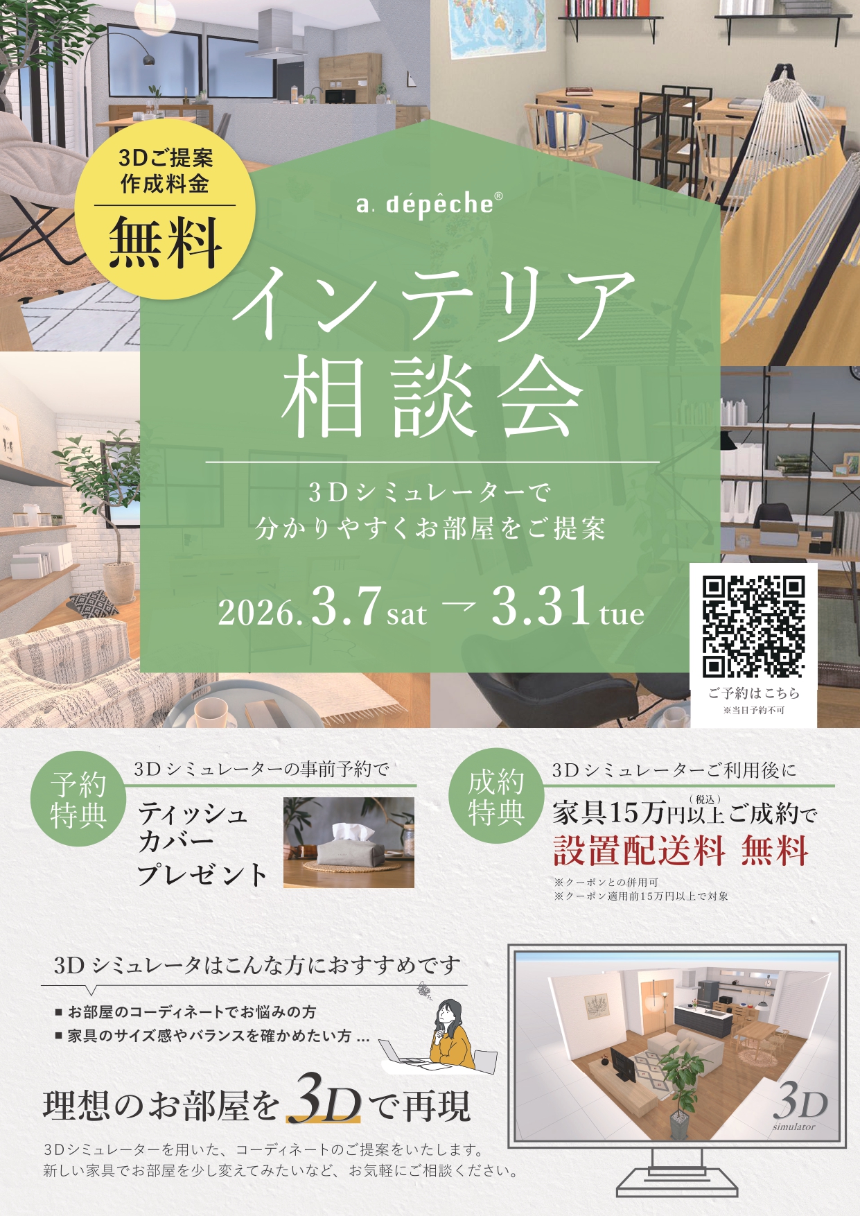 After using the 3D simulator, Free installation and delivery for furniture purchases over 150,000 yen (tax included) It will be.