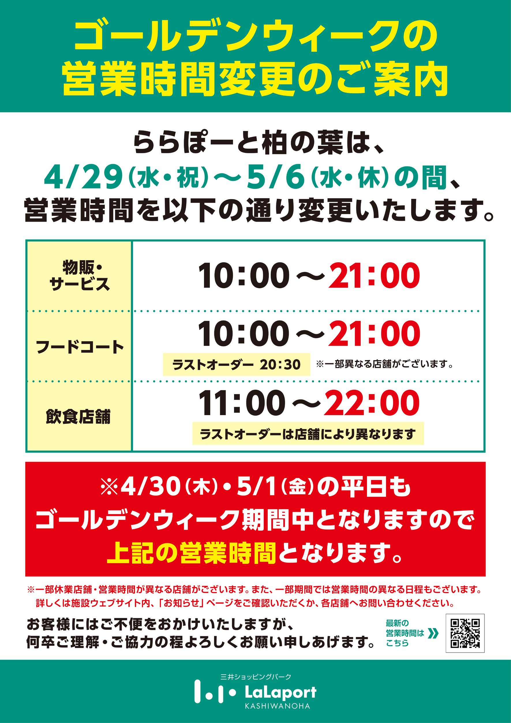 During the Golden Week period, LaLaport KASHIWANOHA will be changing Hours of operation as described above.
