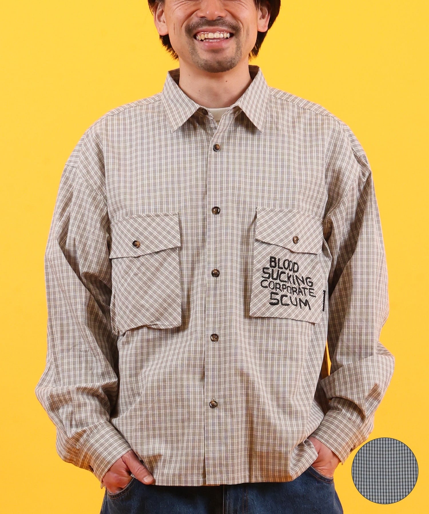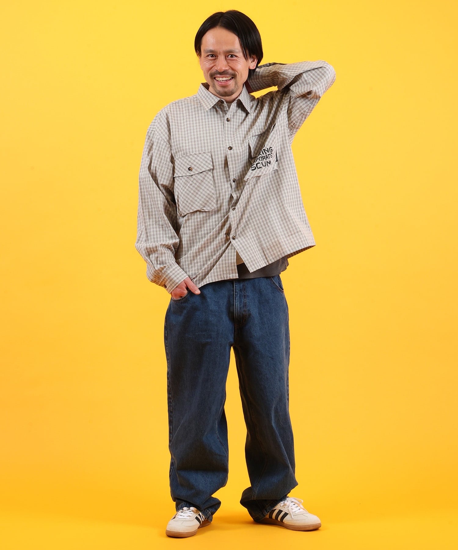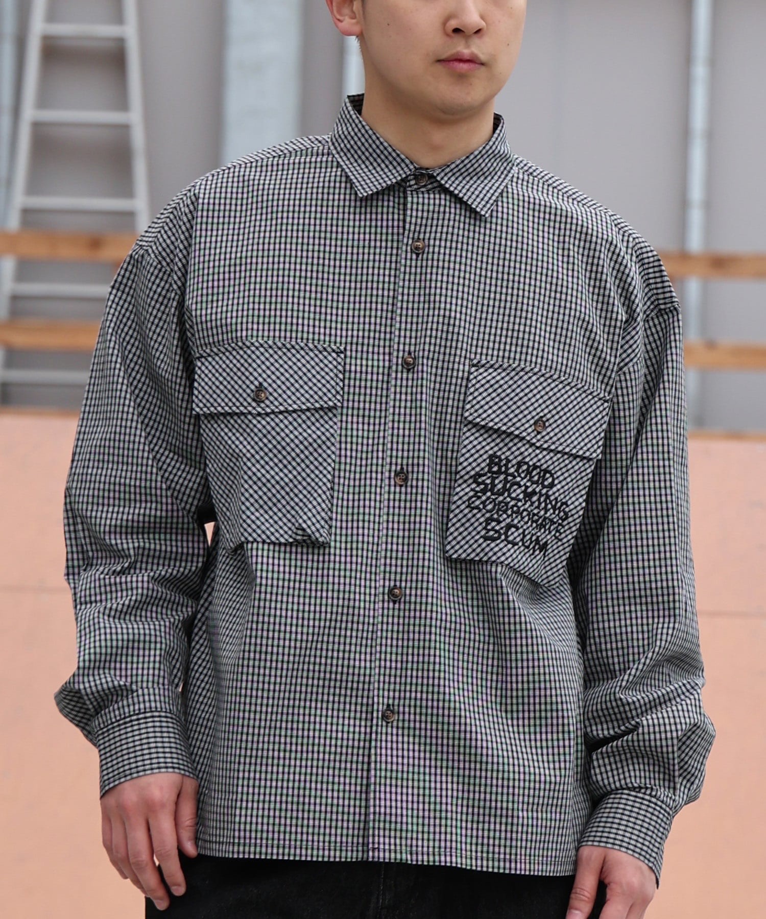The fabric has a small check pattern for a street feel.