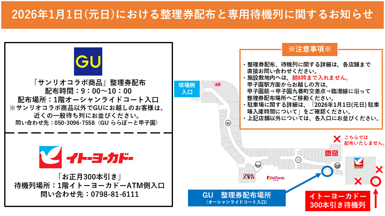 2026年1月1日(元日)におきまして、下記店舗には専用の待ち列がございます。