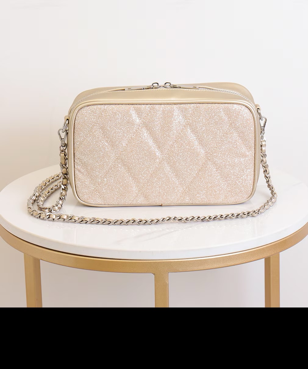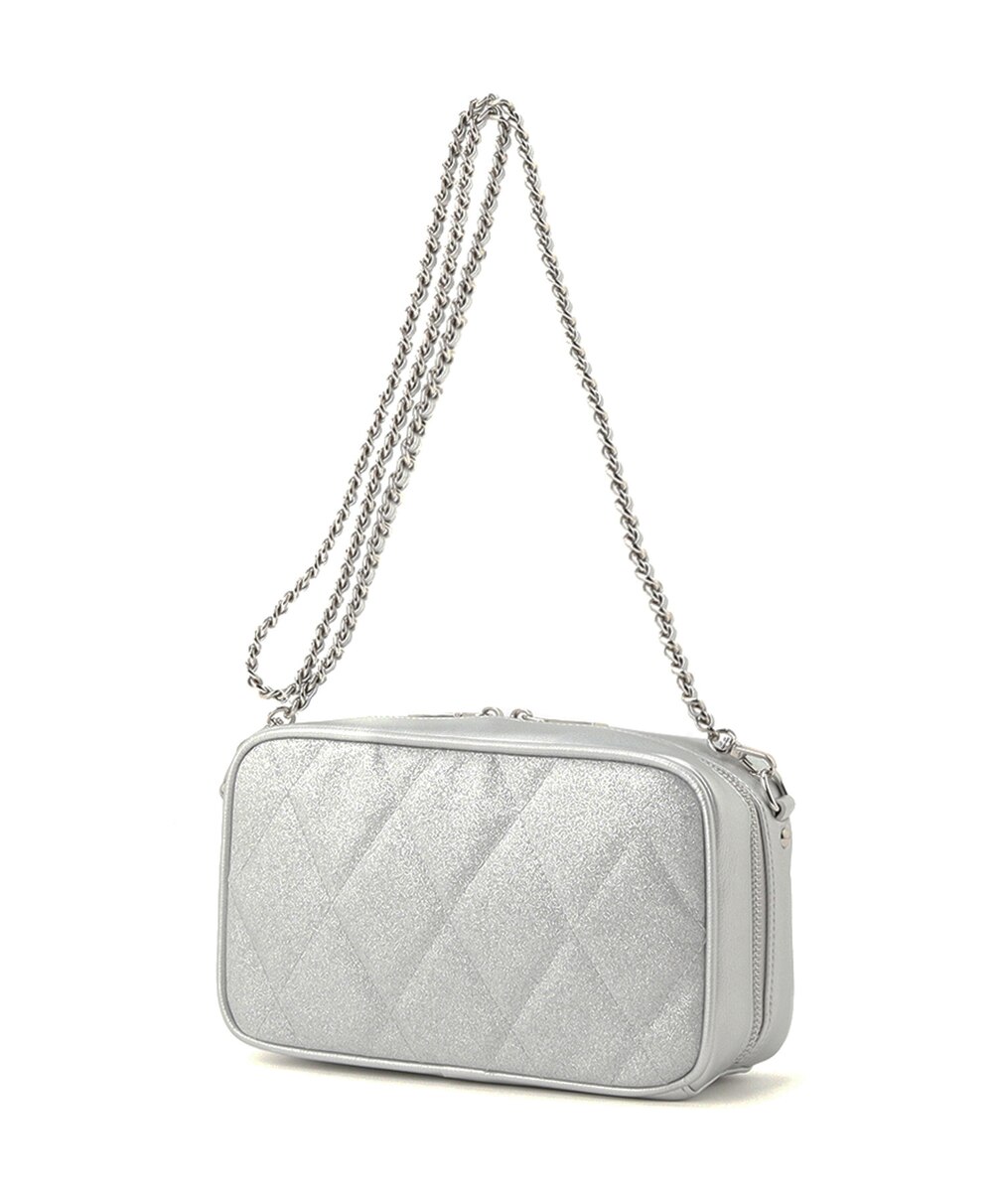 A sophisticated shoulder bag with fine glitter and diamond quilting.