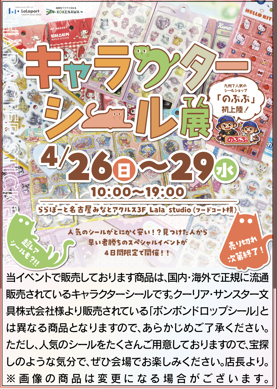 A special event, "Character Sticker Exhibition," will be held for four days only at LaLaport NAGOYA minato AQULS.