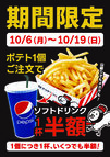 - えっ!?【ドリンク全サイズ半額キャンペーン!】ポテトご注文で!!!2025/10/06(月)から!!