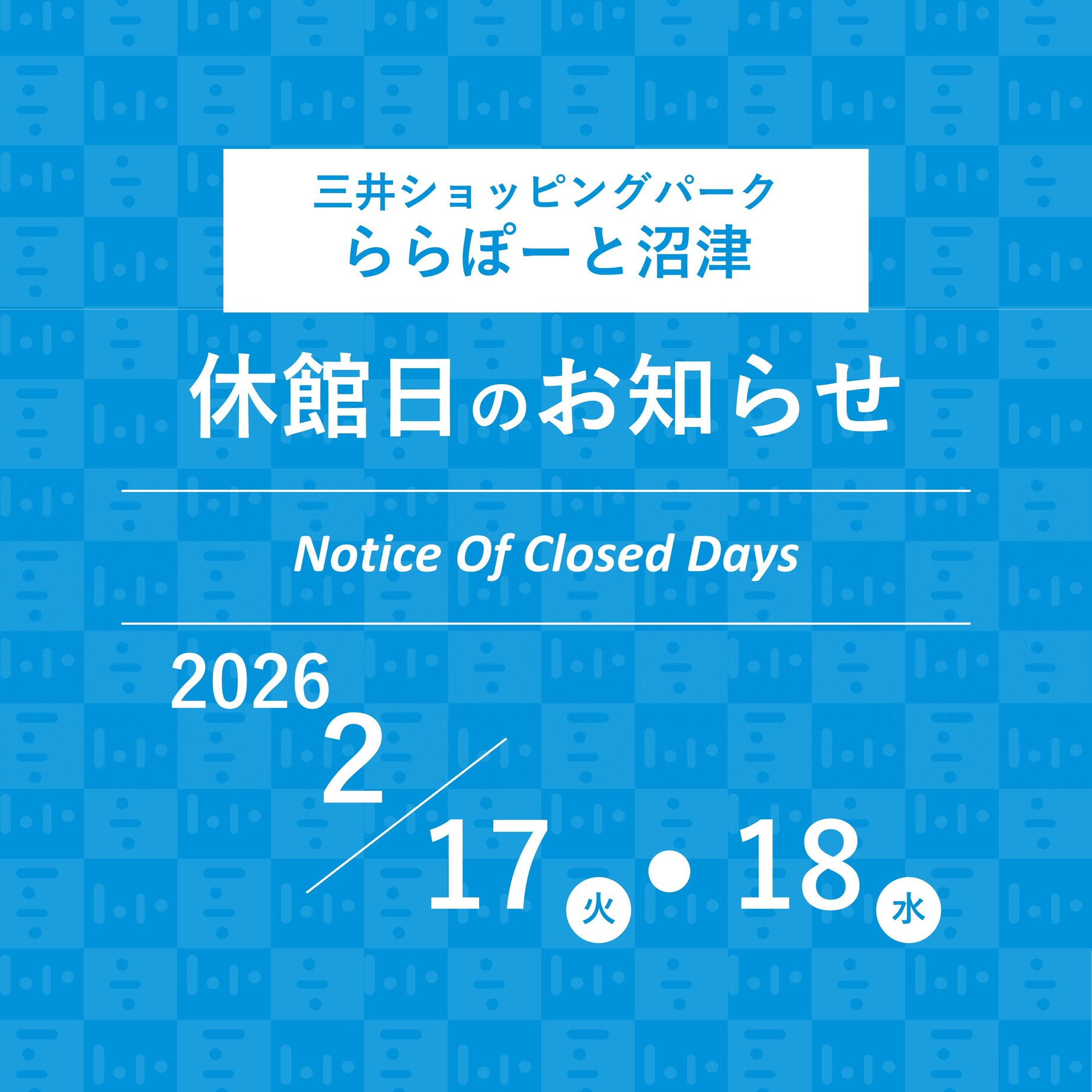 LaLaport NUMAZU will be Closed onTuesday, February 17thand Wednesday, February 18th,2026.