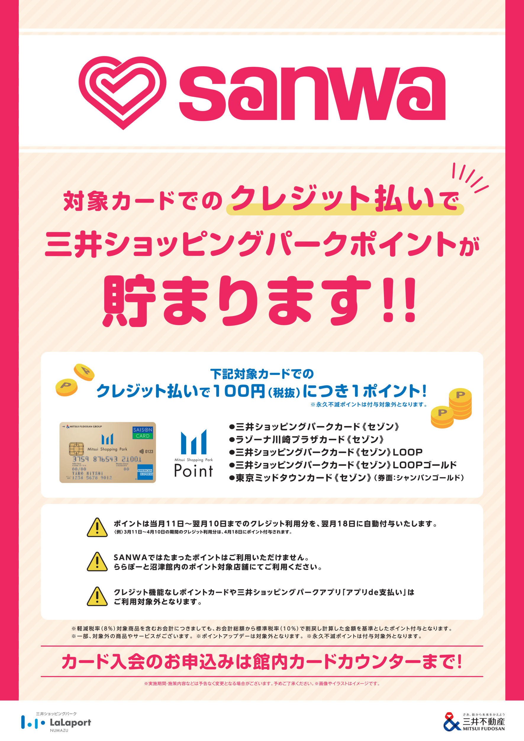 At the SANWA supermarket, starting Monday, December 22nd, you can earn Mitsui Shopping Park points when making eligible credit card payments!