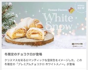 "Premium CHOCOCRO White Snow" is a premium CHOCOCRO available only this winter, inspired by the romantic snowy scenery that decorates Christmas. Milky white chocolate is wrapped inside the same flaky croissant dough that is also used in Saint Marc Café 's classic "CHOCOCRO" and then carefully baked. The baked surface is then sprinkled with a generous amount of powdered sugar, resembling fine snow that has just fallen from the night sky. The magical atmosphere created by the powdered sugar and the melting taste of the white chocolate will enhance the Christmas mood, making this a dish that can only be enjoyed at this time of year.