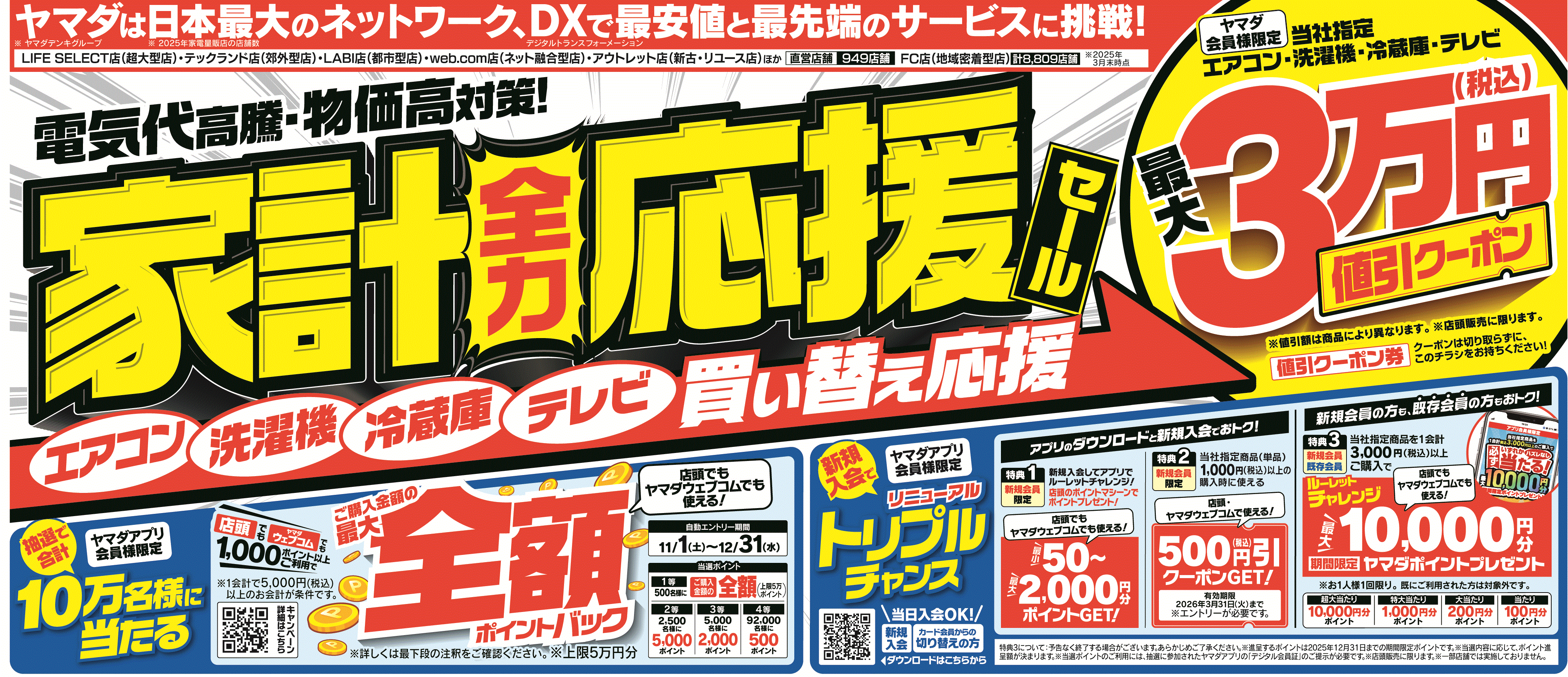 ☆Yamada App Members Only☆ A total of 100,000 people will be entered into a lottery to win. Use 1,000 points or more at stores or on Yamada Web.com. Earn up to the full amount of your purchase in points