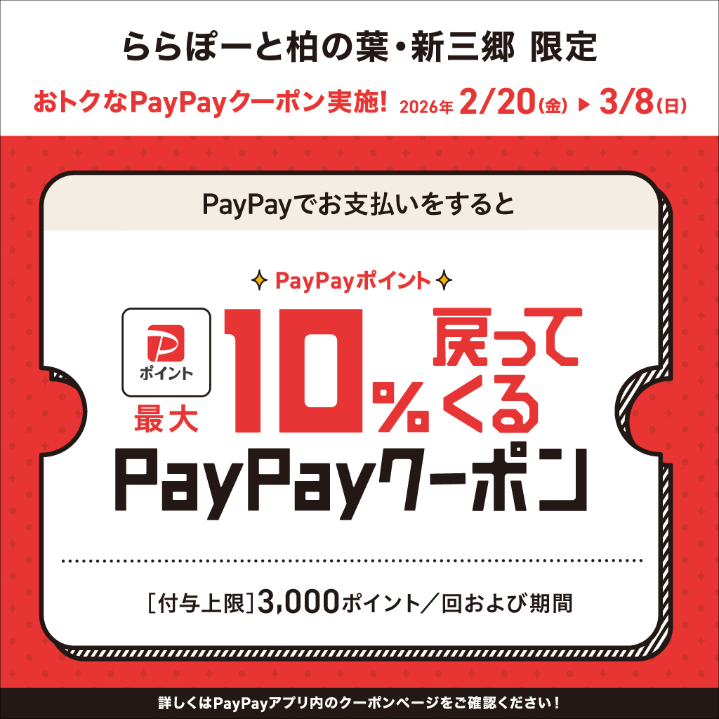 From Friday, February 20th to Sunday, March 8th, if you obtain a coupon within PayPay in advance and use PayPay to pay at participating stores, you will receive up to 10% of your purchase amount in PayPay points at a later date.