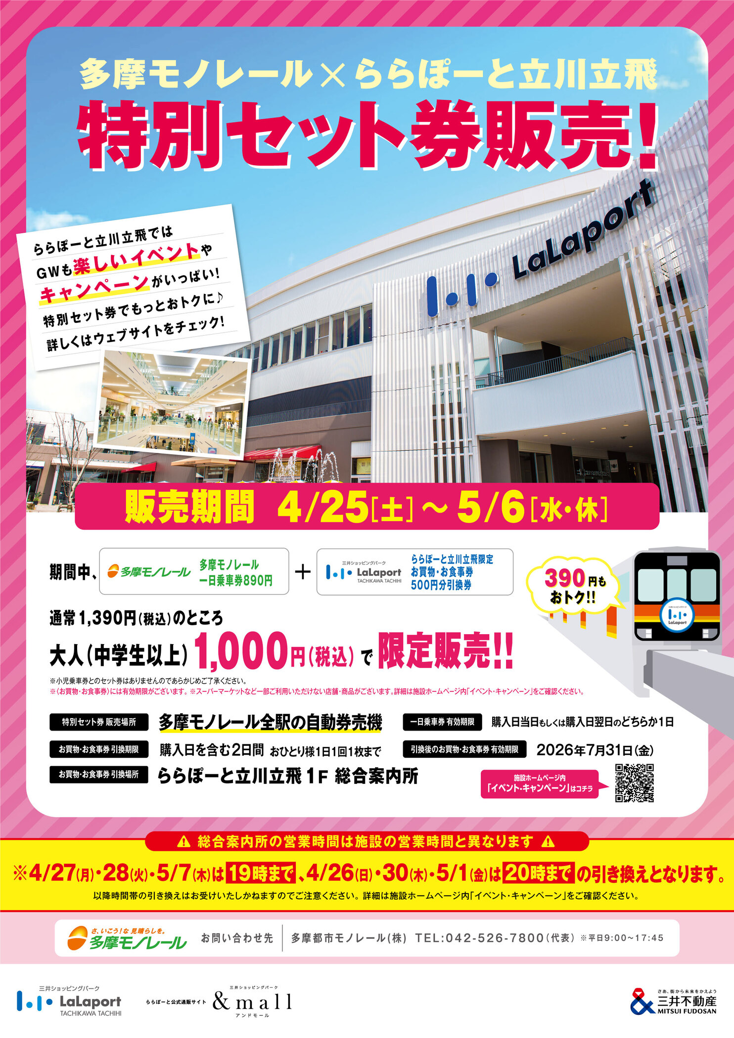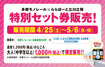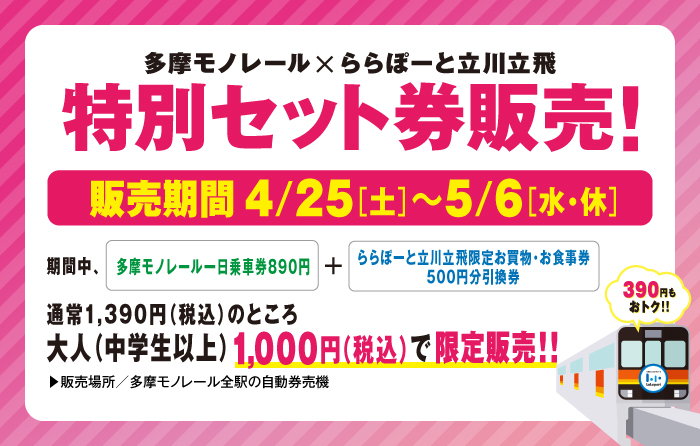 During this period, a Tama Monorail one-day pass (890 yen) plus a 500 yen voucher for shopping and dining LaLaport TACHIKAWA TACHIHI will be sold for a limited time for 1,000 yen (tax included) for adults (junior high school students and older)!
