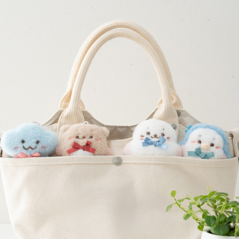 This cute keychain is made from popular fluffy fabric and features a soft pink blush.