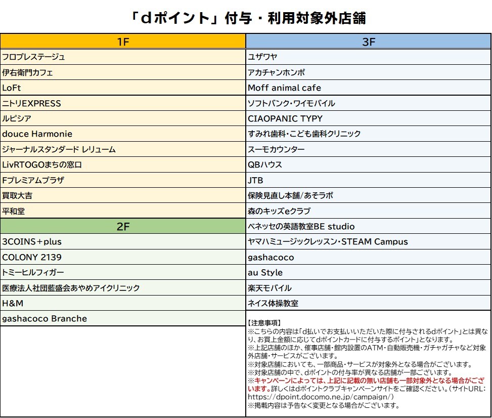 While this facility allows you to earn and use both Mitsui Shopping Park Points and "d Points," please note that the stores listed in the image are not eligible for earning or using "d Points."
