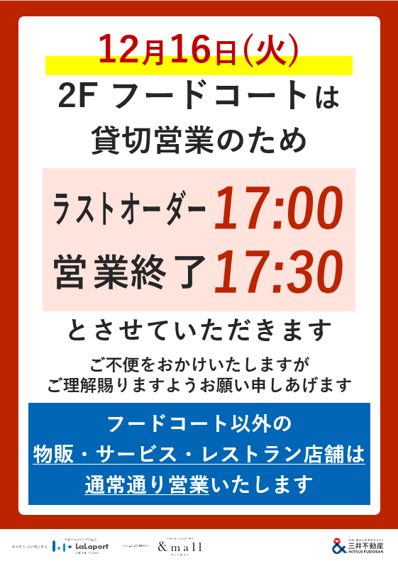 Notice of change in 2nd floor food court Hours of operation on Tuesday, December 16th