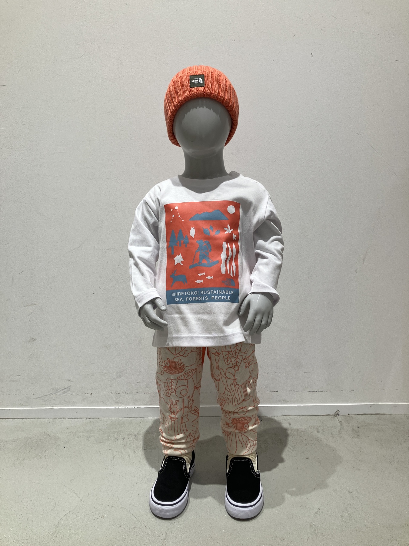 ジャケットを脱いでも、インナーのロンTにはトコさんが知床の山道を歩きながら、さまざまな動植物に出合う様子をイメージしたグラフィックが描かれており、可愛さもしっかり演出。