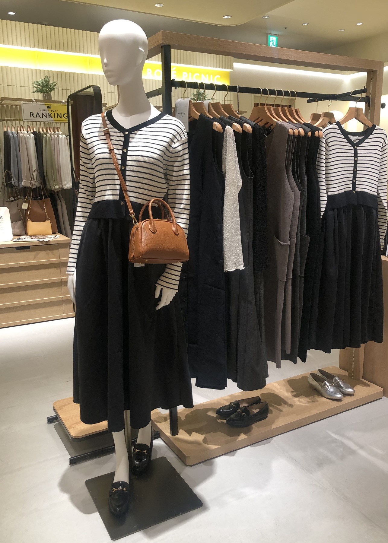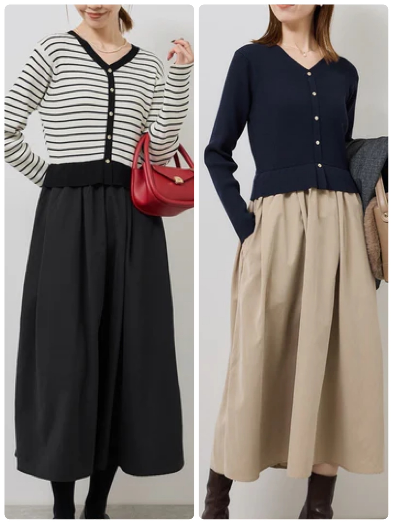 ・ニットに布帛のスカートをドッキングした一枚でおしゃれに決まる楽なワンピース。
