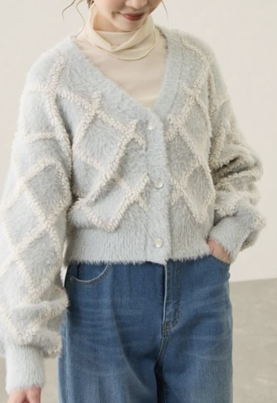 - The diamond pattern uses loop yarn with a textured feel to create a three-dimensional effect.