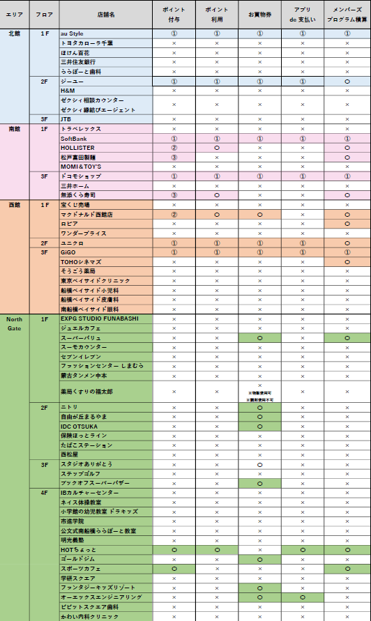 The above Shops offer different Services regarding Mitsui Shopping Park points, shopping vouchers, app payments, and member program accumulation.