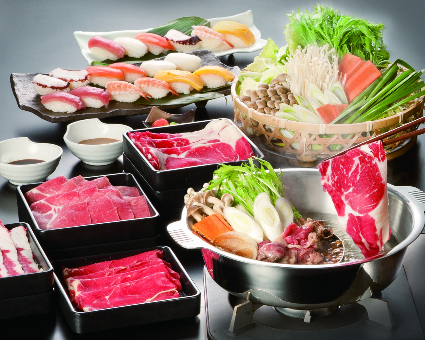 This restaurant offers all-you-can-eat shabu-shabu and sukiyaki, where you can enjoy safe and secure beef and pork with unlimited refills, fresh vegetables selected from the vegetable bar, and two types of broth. Everyone from children to seniors can enjoy meat and vegetables to their heart's content in a visually appealing restaurant with an array of fresh vegetables on display. An all-you-can-eat course with nigiri sushi is also available.