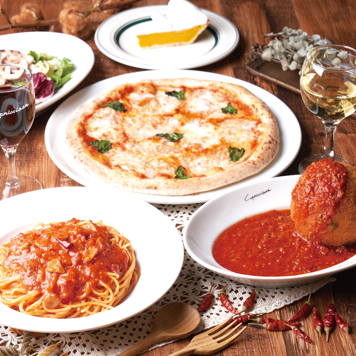 All capricciosa restaurants use the same recipe for their menu items, and each one offers the delicious taste of authentic Southern Italian homemade food. The tomato sauce, made with Italian tomatoes in particular, is mellow and rich, and the dishes created using this sauce are a signature dish that capricciosa is proud of, attracting many fans.