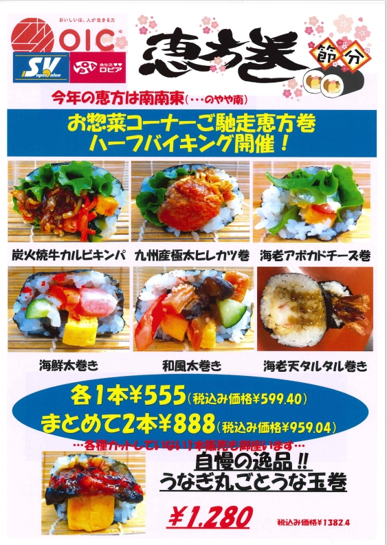 ●In the deli section, we will be selling half-sized Ehomaki buffets for 599.40 yen (tax included) each, or 959.04 yen (tax included) for two!