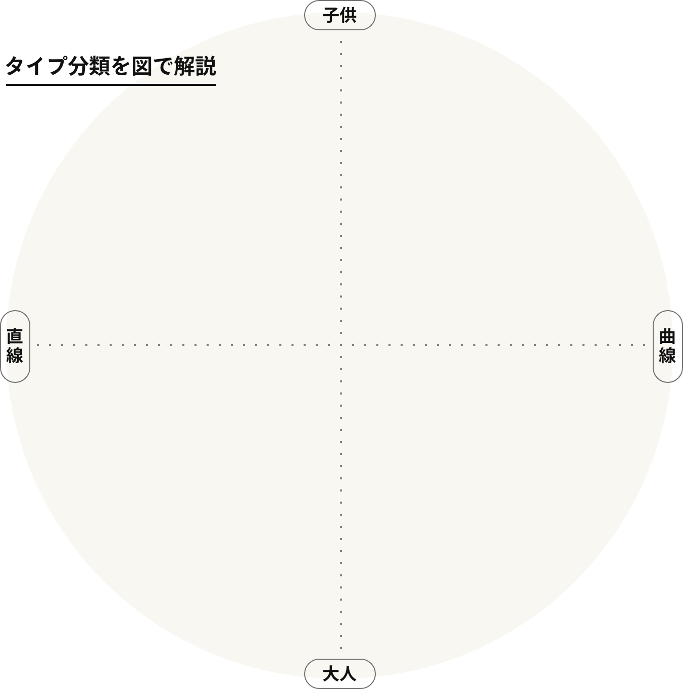 子供×直線・曲線の両方を併せ持ち、清潔感があり若々しく見られやすいタイプです。柔らかさの中にも輪郭やパーツのどこかにシャープさがあり、親しみやすい、爽やか、優しそうなどの第一印象を与えます。Tシャツにデニムなど、爽やかでシンプルなものが似合います。
