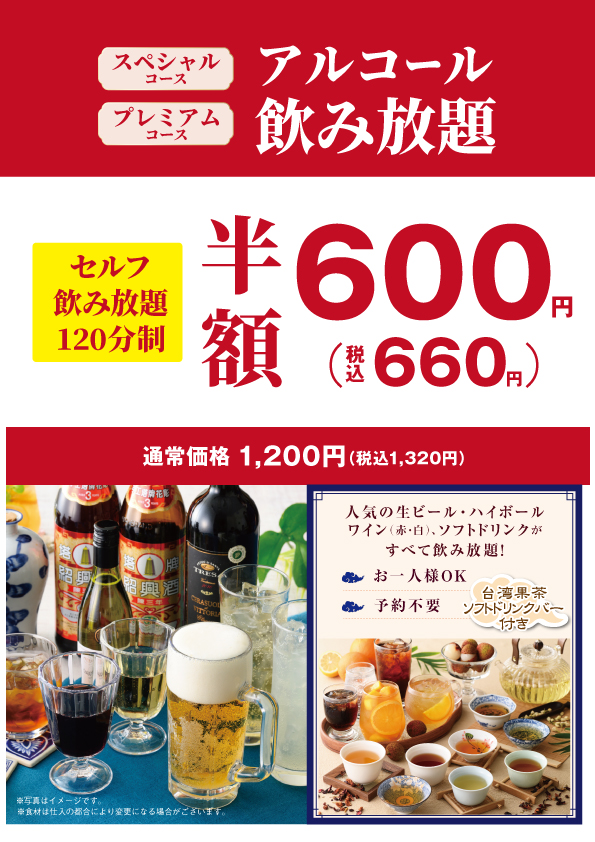 (生ビール・ハイボール・赤白ワイン・ソフトドリンク)