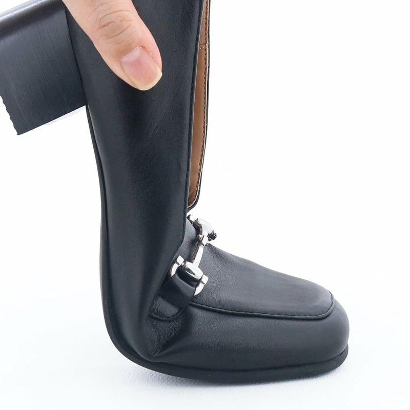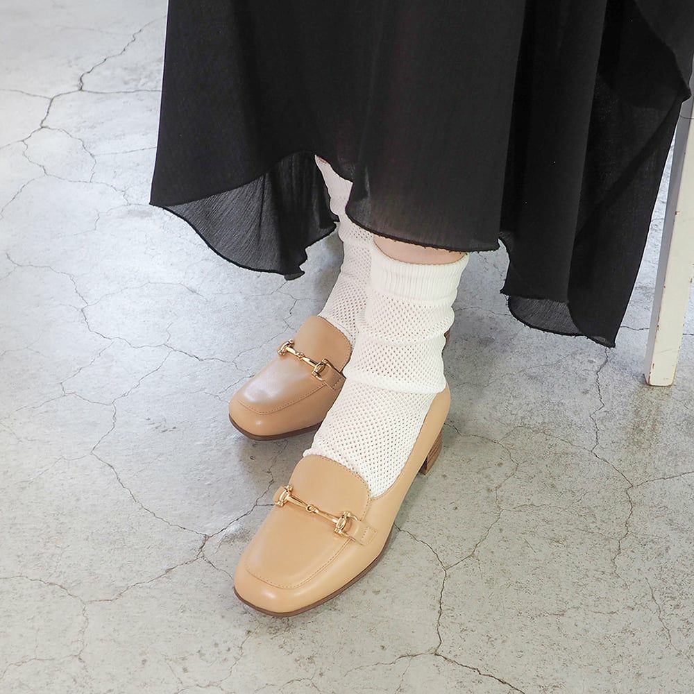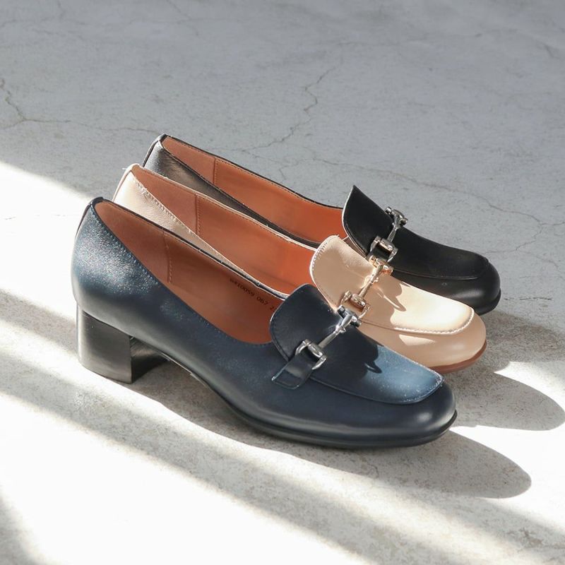 クラシックなローファーを絶妙なヒールスタイルで仕上げた上品なビットモカパンプス。