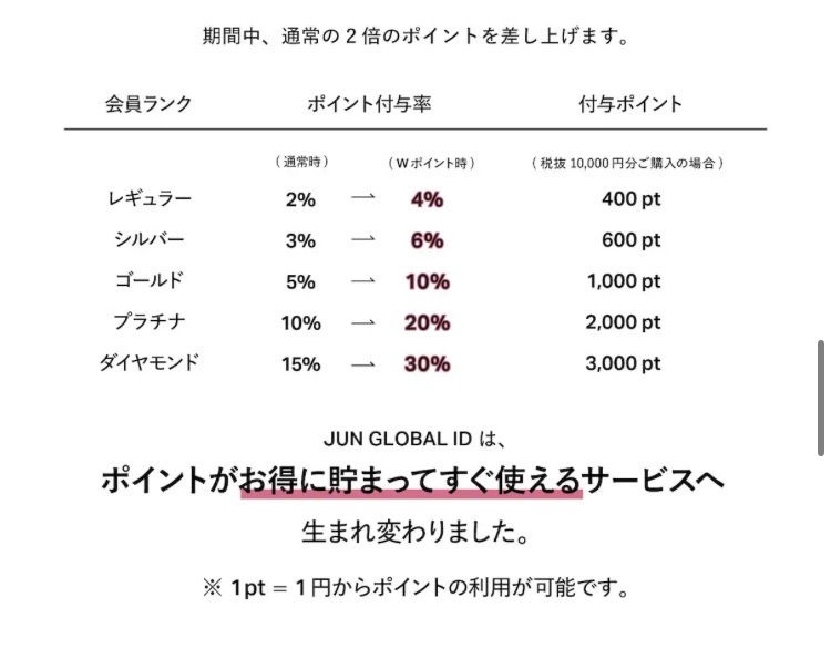 During this period, you will receive double the usual amount of JUN GLOBAL ID points that can be used at the Jun Group, based on the amount and rank of the items you purchase at regular price. Please take advantage of this opportunity.