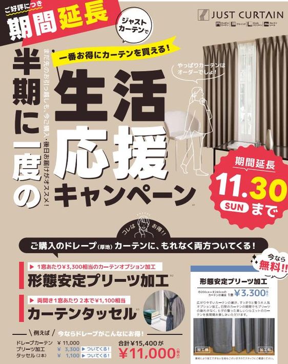 A single custom-made curtain for both windows is priced at a flat rate of 10,000 yen. You can choose from 800 different samples in the store. We handle everything from fabric planning to sewing and installation in-house. We are confident in our prices, quality, and designs. We also handle blinds, roller screens, and other window decor needs.
