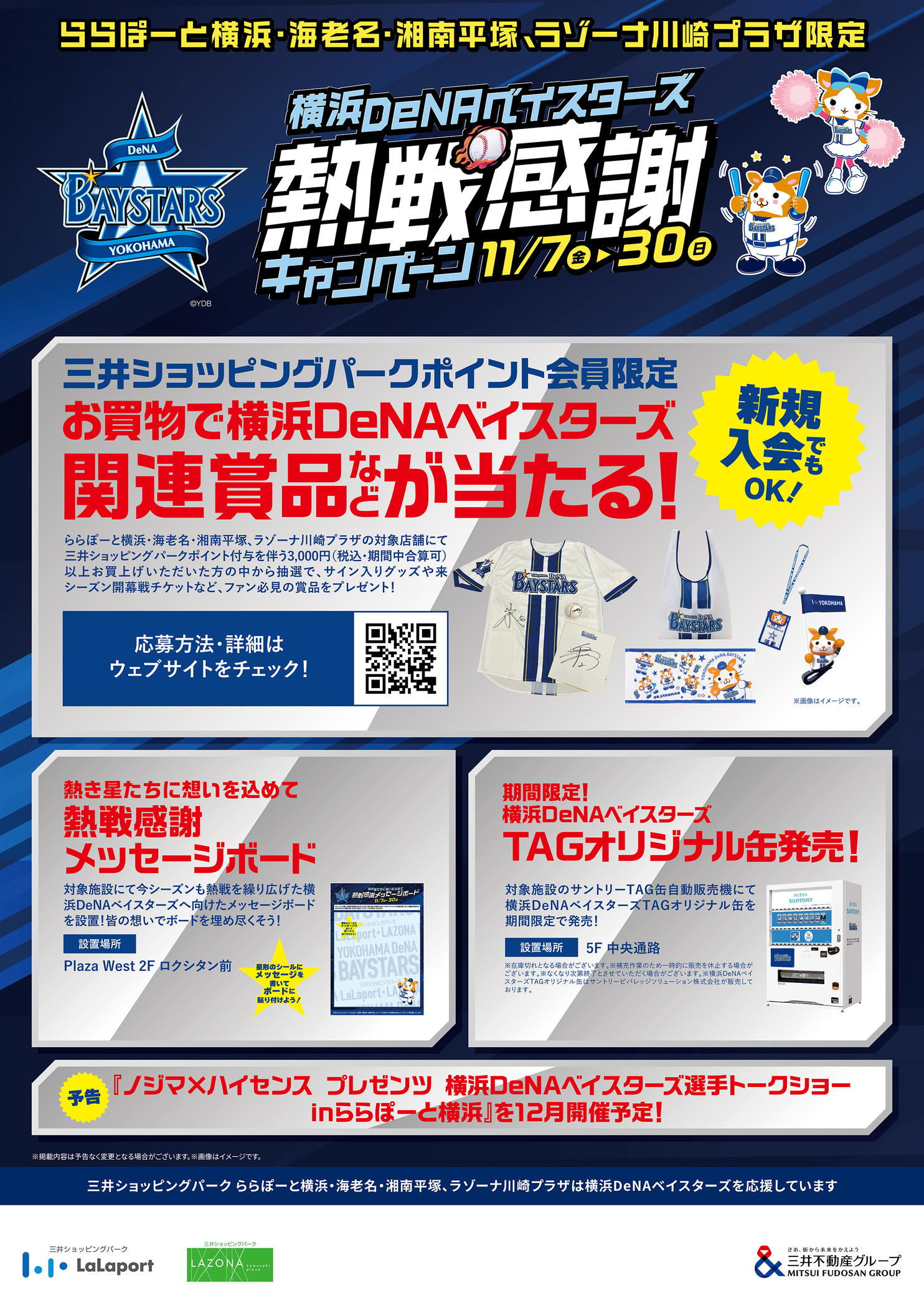 During the application period, those who make purchases of 3,000 yen (tax included, can be added up during the period) or more with Mitsui Shopping Park points at LaLaport YOKOHAMA, Ebina, Shonan Hiratsuka, and LAZONA Kawasaki Plaza will be selected by drawing to win must-see prizes for fans, including autographed goods and tickets for the season opener next season!