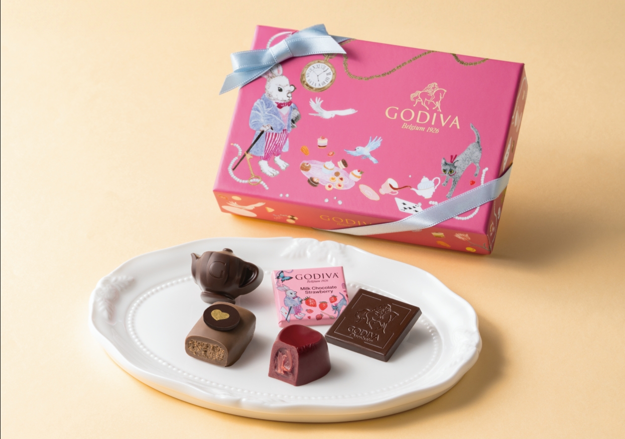 The cute "Alice's Tea Party Collection" offers chocolates inspired by the memorable "tea party" scene from "Alice in Wonderland." The collection includes chocolates inspired by the tea that adorns a tea party, heart-shaped chocolates revamped to commemorate GODIVA 's 100th anniversary, and seasonal limited edition calendars, all packaged with illustrations of symbols from the story, such as playing cards, a tea set, and the White Rabbit.