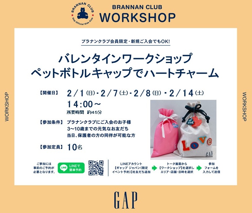 - Gap Valentine's Day Shops will be held on February 1st (Sun), 7th (Sat), 8th (Sun), and 14th (Sat)! *For children aged 3-12