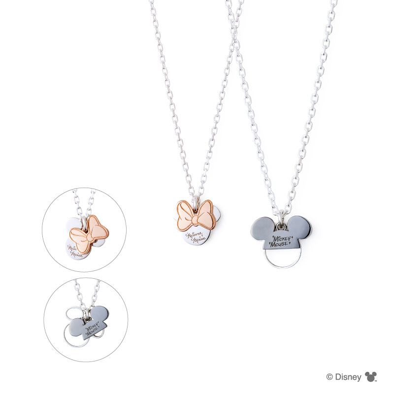 This pair of necklaces features two parts that, when layered together, create silhouette of Mickey and Minnie.