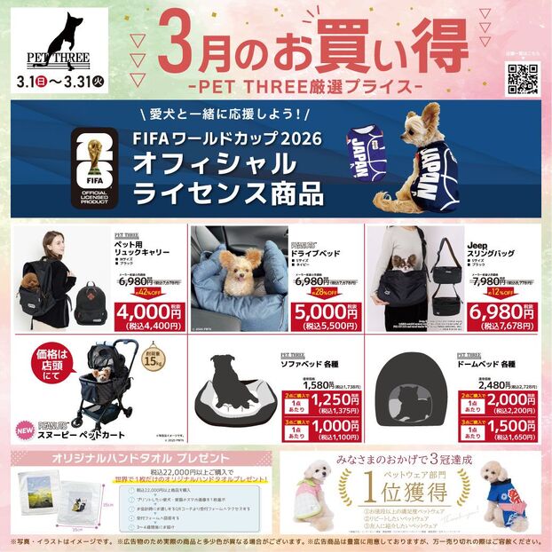 | Brand Concept | "The more clothes you have, the cuter it becomes" is the concept behind PET THREE. We provide high-quality, low-cost products, and aim to be a brand that provides satisfaction beyond the price by enriching the lives of people and pets. |
