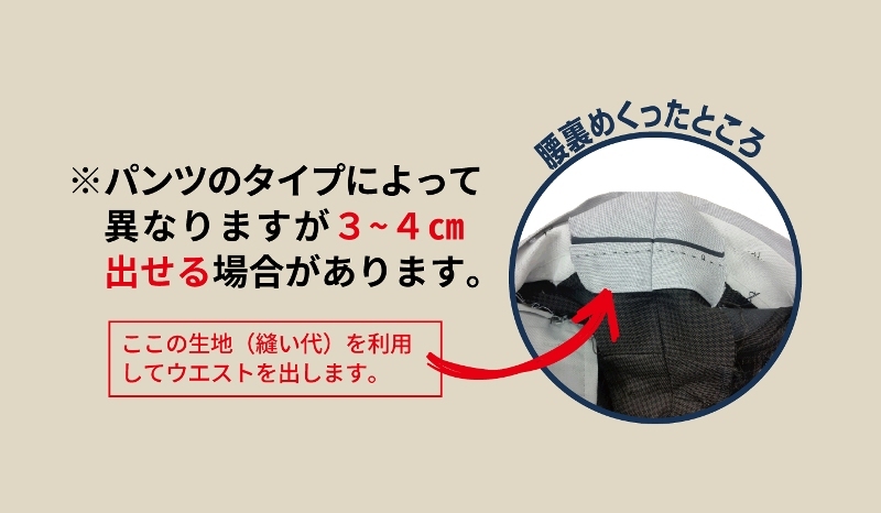 Slacks often have a relatively large amount of seam allowance left and there is a good chance that the waist can be exposed, so they are recommended for people who wear suits for sitting jobs.