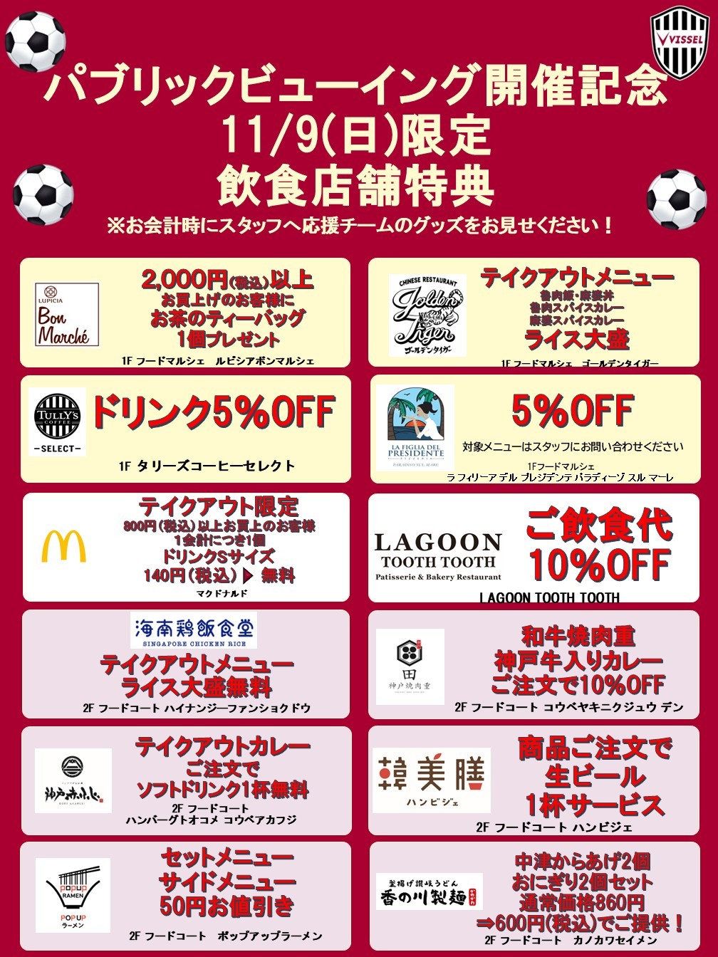 In conjunction with the Vissel Kobe public INGNI to be held on Sunday, November 9th, some restaurants will be offering special benefits!!!