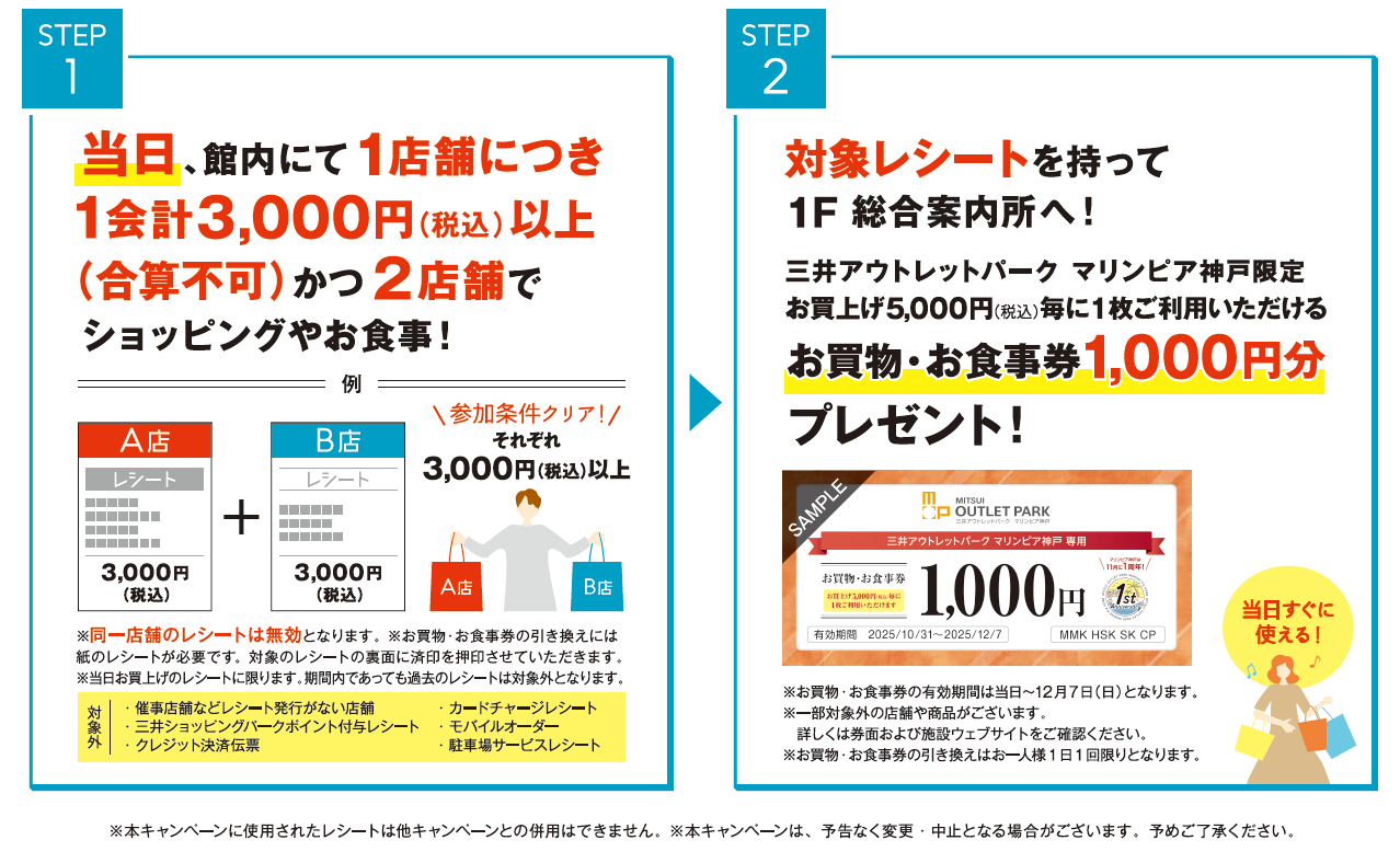 We will give you a 1,000 yen shopping and meal voucher, which can be used one for every 5,000 yen (tax included), exclusive to MITSUI OUTLET PARK MARINE PIA KOBE!