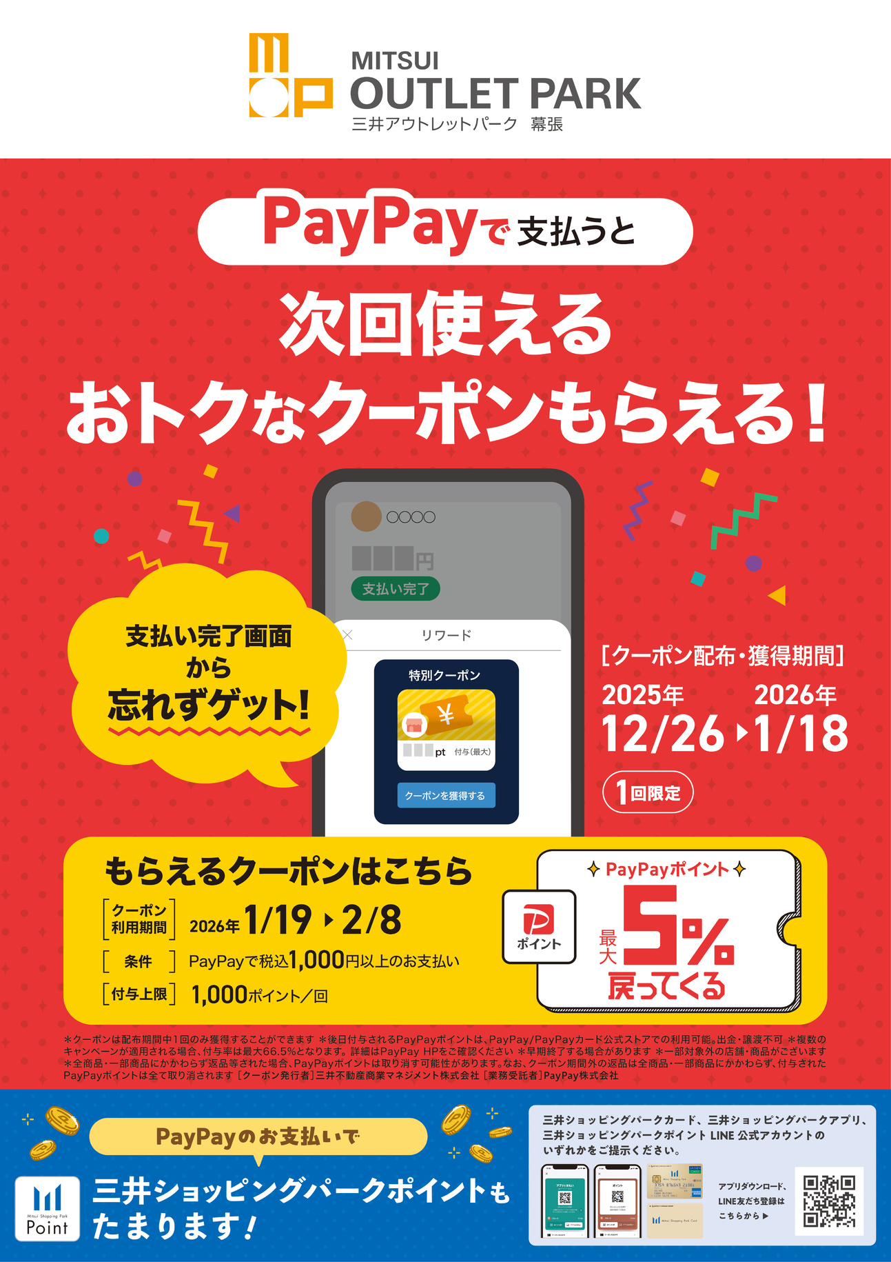 At MITSUI OUTLET PARK MAKUHARI, if you pay with PayPay during the period from December 26th (Friday) to January 18th (Sunday),